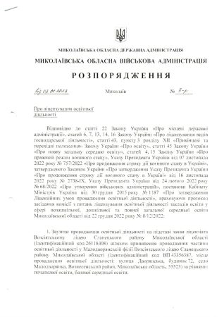 Розпорядження “Про ліцензування освітньої діяльності”